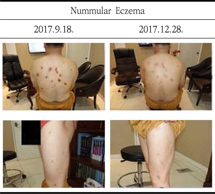 치료 및 경과 : 2016년 9월 10일에 첫 내원 후 약 5주 경과 후 초진 내원 시와 비교하여 가려움증이 50%경감, 17주 후 80%경감되었으며 기타 홍조, 삼출물 등도 전체적으로 호전되었다. 본원 치료 중 소화 상태 및 대소변 상태 변화, 수면상태 변화 등의 소증 변화는 발생하지 않았다(Fig. 5).