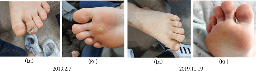 2019년 2월 14일경 양 손의 조갑주위와 좌측 족2지의 조갑 사마귀가 조금씩 떨어져 크기가 감소하였고, 보행 및 운동 시 발생하는 발바닥의 통증은 이전 내원 당시와 비슷하게 유지되었다(VAS 2). 한약 복용 후 부 작용을 호소하지는 않았으나 환자 나이가 어리고 한약 복용을 선호하지 않아 꾸준한 복용이 지켜지지 않았다. 환자 요청으로 한약치료는 중단하였고 티 트리 오일을 이용한 Aorma therapy만을 지속하였다.