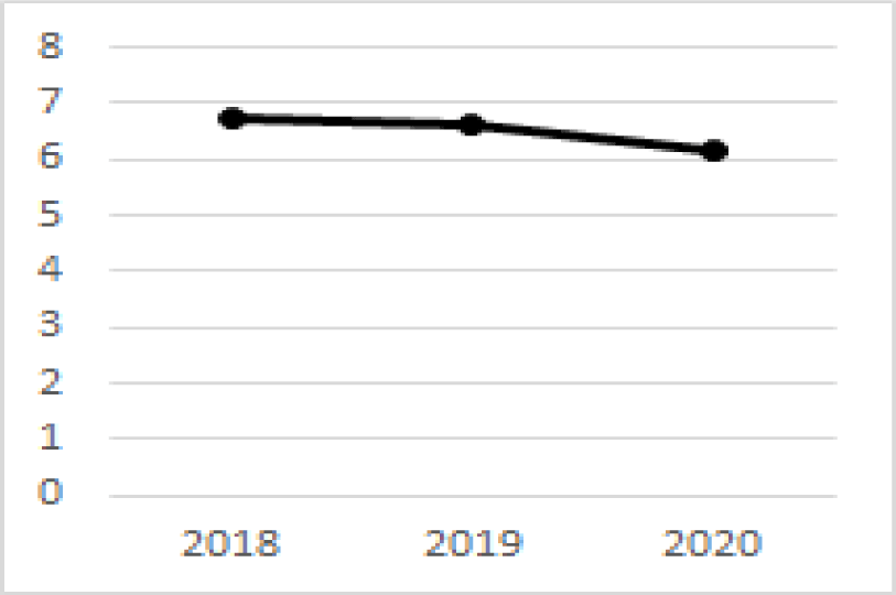 연도별 내원 횟수 차이를 일원배치 분산분석을 통해 검증한 결과, 2018년 6.75회, 2019년 6.63회, 2020년 6.15회로 거의 유사하였고, 통계적으로도 유의한 차이를 보이지 않았다(F=0.297, p=0.743)(Fig. 6).