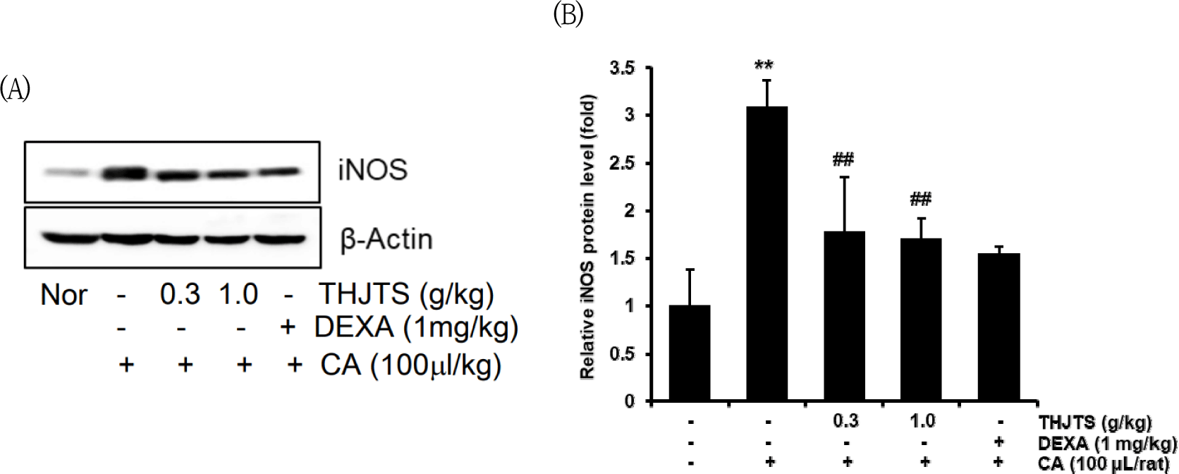 iNOS 단백질의 발현에서 CA군에서는 normal군(1.00±0.38) 대비 3.09±0.27배로 유의하게 증가되었다(p<0.01). THJTS 0.3g/㎏ + CA군에서는 1.77±0.57배, THJTS 1.0g/㎏ + CA군에서는 1.70±0.21배로 CA군과 비교하여 유의미하게 감소되었고(p<0.01), 이것은 양성대조군으로 사용된 DEXA군(1.55±0.07)과 유사한 수준을 나타내었다(Fig. 11).